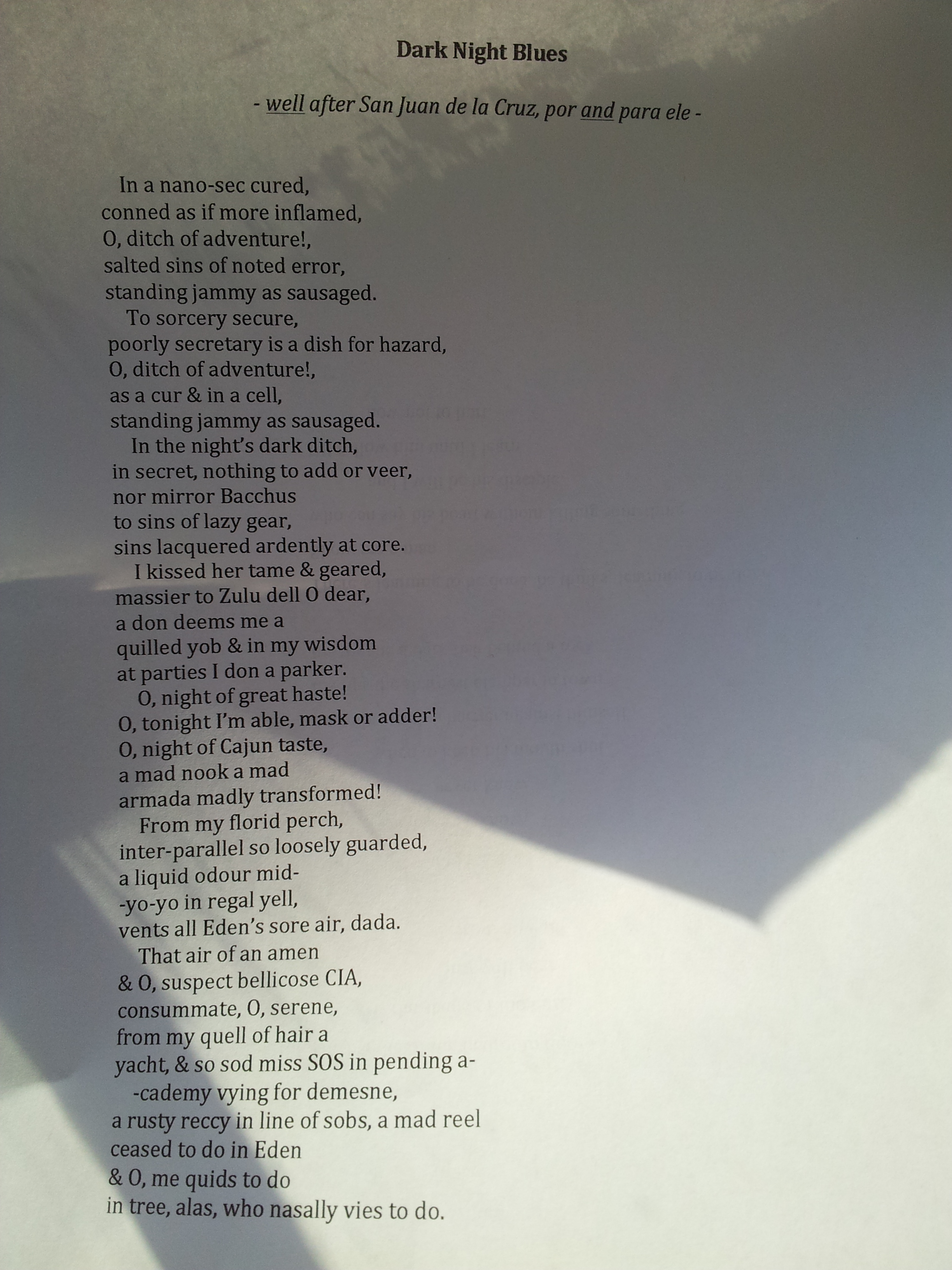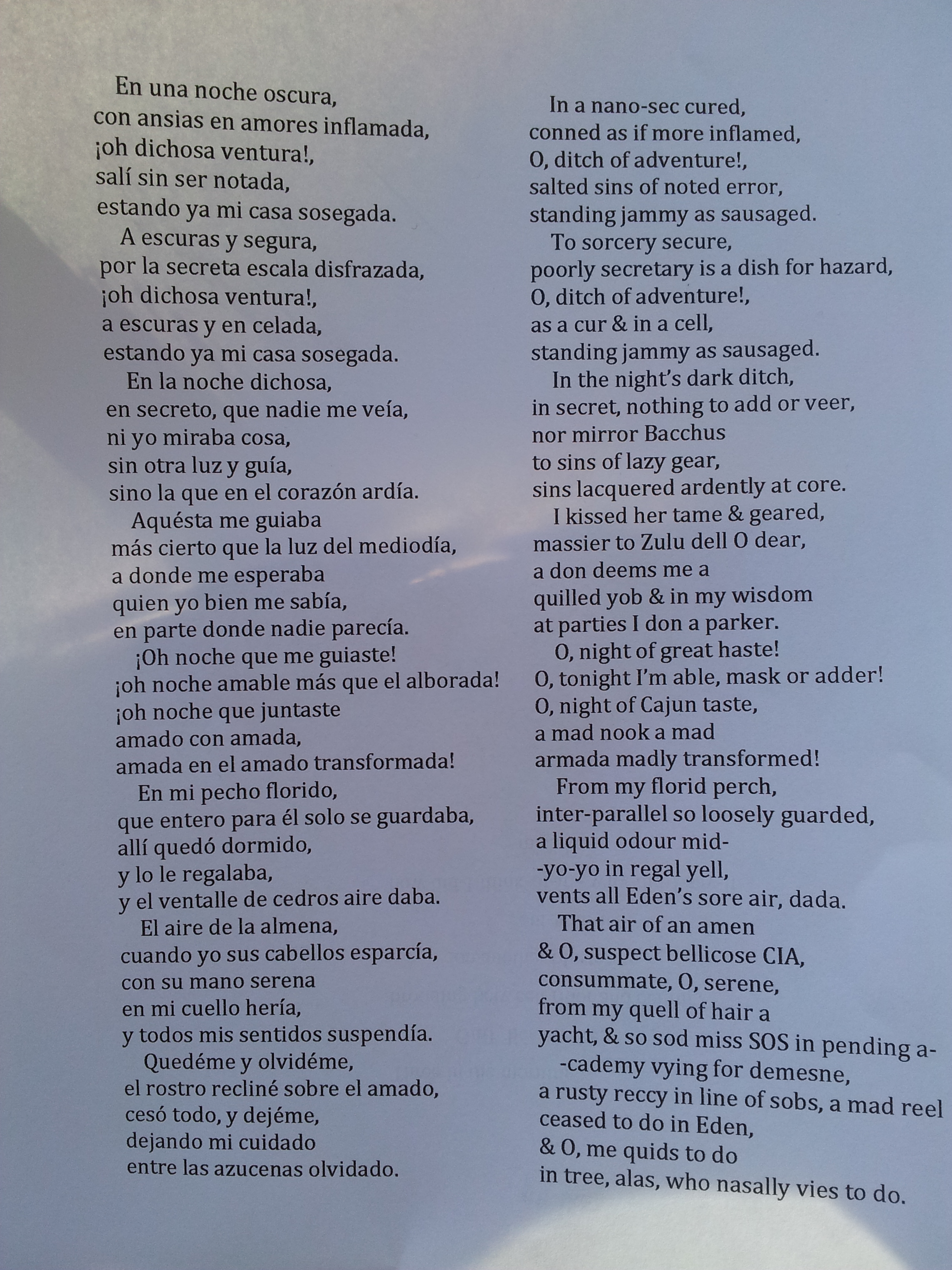 – a vandalisitic / homophonic / back-translated /anagram-ed traducción muy libre of San Juan de la Cruz’s ‘Noche Oscura’, from the book La noche oscura del alma (The Dark Night of the Soul). Sorry Spanish literature, sorry Real Academia, sorry mysticism –