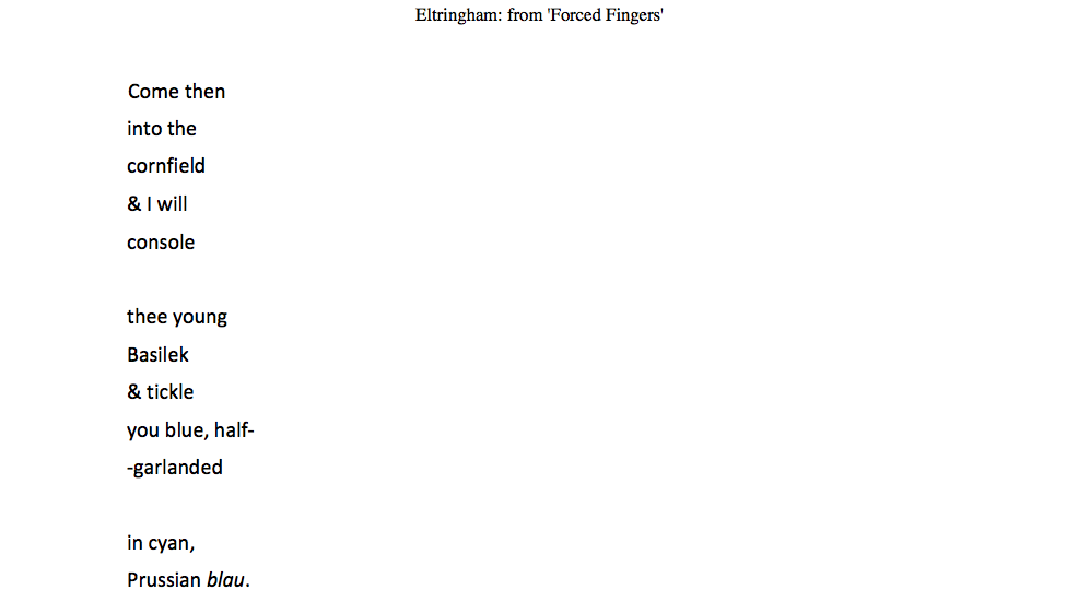 Really chuffed last week to see two more sections of my field work thing Forced Fingers appear in the Canadian ecocrit journal The Goose. Actually what was even more pleasing is what I am claiming as my first ever piece of literary criticism: poetry editor Camilla Nelson said in her editorial that ‘Eltringham is an English poet forging an anti-capitalist form of pastoral. The extract included from ‘Forced Fingers’, is an interruptive revisioning of a more archaic vocabulary.’ Which gets it pretty exactly. And most gratifying of all, that ‘His work complements that of Stephen Collis [also in this issue] who is also occupied with reinventing the Romantic idiom.’ For completists: the other three sections in the sequence were published in The Clearing, so if you’ve really got nothing much on it is theoretically possible to piece it together I – V.