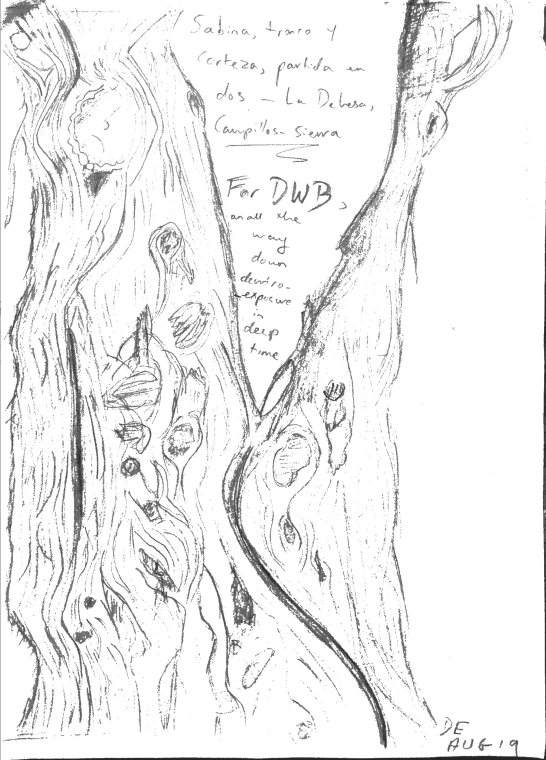 When I heard the news I was in a small village in central Spain, ecologically important for the quantity of its sabinas, a twisty-barked tree that likes dry, thin soil & plenty of space, and which is globally endangered, but there very common. I went out to the forest with a pad of paper & pencil, thinking I would draw, which I rarely do. I sat in front of a sabina whose trunk had been split in two, perhaps by lightning (the summer storms there are frequent & dangerous, but luckily the horizon of the landscape is so large you can see them a day before they hit you), and drew slowly for about 2 hours. I think David would have liked it here. Here is the drawing, as well as some of the text-image slates David & I worked on together. For DWB.